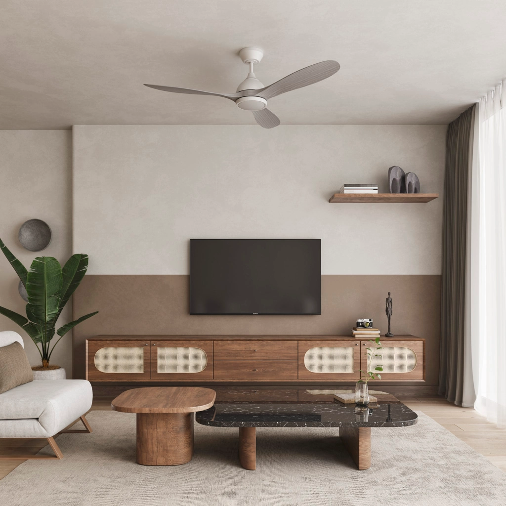 Ventilador de techo NATA con luz LED integrada y memoria de temperatura de color. Cuenta con un cuerpo