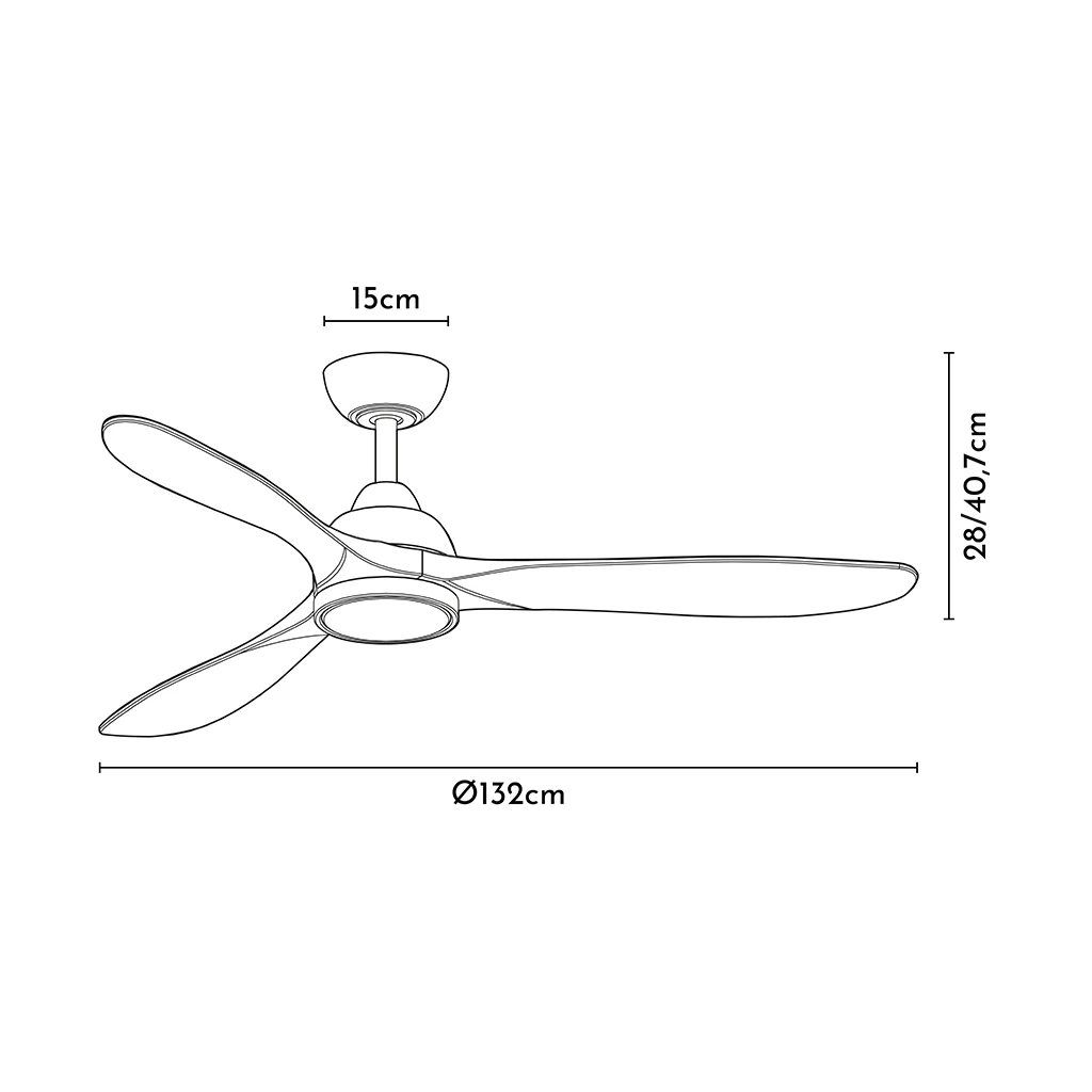 El ventilador de techo MALLORCA incorpora luz LED y memoria de temperatura de color. Cuenta con un cuerpo