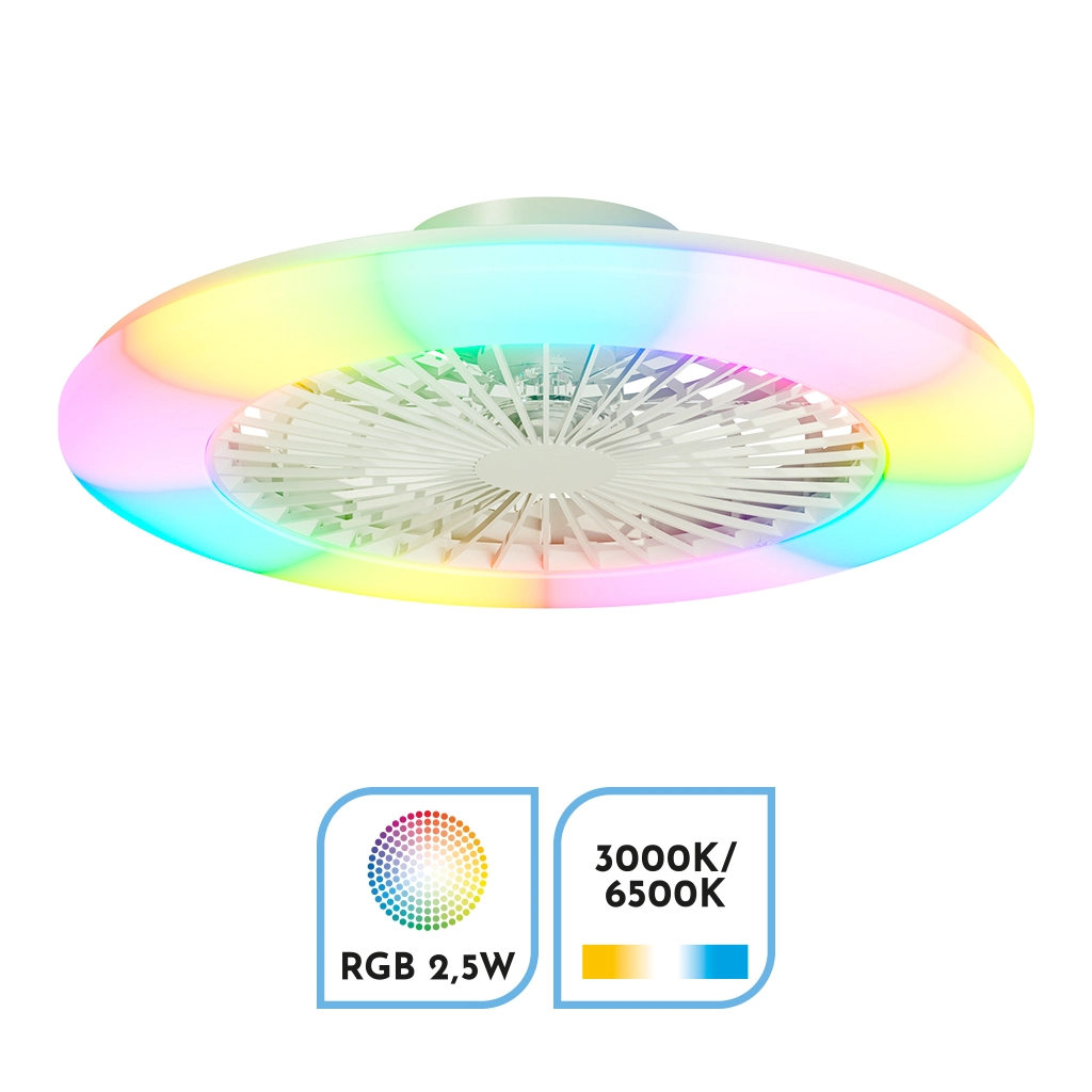 The CARTAGENA ceiling fan incorporates LED light, an RGB light halo and color temperature memory. It has a